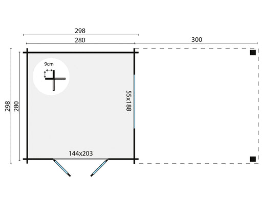 Original price €2.231,55 - Original price €2.231,55Original pricePrijs: €2.231,55€2.231,55 - €2.231,55Per stuk Prijs: €2.231,55| /Dikte wand 28mm Houtsoort geschaafd vuren Afmeting 298x298cm Funderingsmaat 280x280cm Nokhoogte ca. 225cm Aantal ramen (vast) 1 Glas enkel glas Dak...