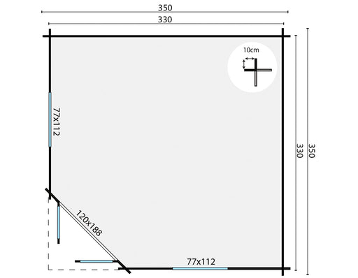 Original price €3.457,05 - Original price €3.457,05Original pricePrijs: €3.457,05€3.457,05 - €3.457,05Per stuk Prijs: €3.457,05| /Dikte wand 44mm Houtsoort geschaafd vuren Afmeting 350x350cm Funderingsmaat 330x330cm Nokhoogte ca. 298cm Aantal ramen (te openen) 2 Glas isolatieg...