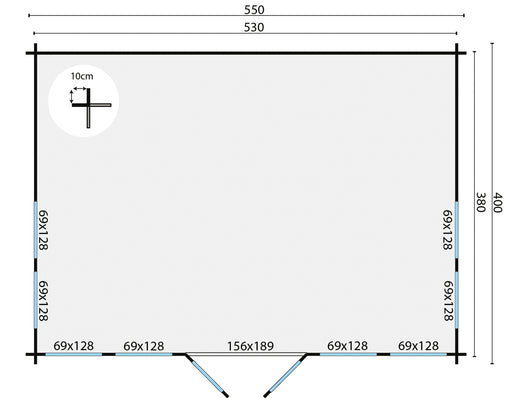 Original price €5.271,55 - Original price €5.271,55Original pricePrijs: €5.271,55€5.271,55 - €5.271,55Per stuk Prijs: €5.271,55| /Dikte wand 44mm Houtsoort geschaafd vuren Afmeting 550x400cm Funderingsmaat 530x380cm Nokhoogte ca. 351cm Aantal ramen (te openen) 8 Glas isolatieg...
