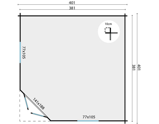 Original price €3.181,55 - Original price €3.181,55Original pricePrijs: €3.181,55€3.181,55 - €3.181,55Per stuk Prijs: €3.181,55| /Dikte wand 44mm Houtsoort geschaafd vuren Afmeting 401x401cm Funderingsmaat 380x380cm Nokhoogte ca. 302cm Aantal ramen (te openen) 2 Glas isolatieg...