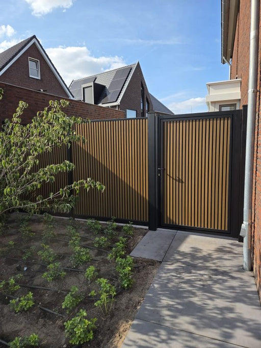 PuraFence tuinschermen worden gemaakt van duurzaam composiet dat voor 95% geproduceerd is uit gerecyclede materialen. Dankzij de co-extrusielaag is het scherm vlekbestendig en kleurvast. Deze premium schutting heeft een luxe uitstraling en wordt geleverd in de uitvoering Royal met een rhombus triple profiel en uitvoering Classic met een standaard gladde plank. Een scherm is 180 x 180 cm en bestaat uit 12 stapelplanken die tussen twee aluminium schuttingpalen worden bevestigd. De stapelplanken kunnen met het begin- en eindprofiel zowel horizontaal als verticaal worden geplaatst. Er is een aluminium deurframe beschikbaar dat geleverd wordt inclusief scharnieren en zwart deurbeslag. In het deurframe kunnen horizontaal 12 stapelplanken worden gemonteerd. De stapelplanken, het begin- en eindprofiel, de palen en het deurframe zijn verschillende onderdelen en moeten los besteld worden. Wil je meer luxe en/of een brede poort kies dan onze stalen poort.